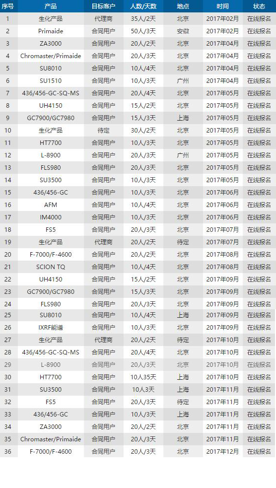 列表中的用户培训将由资深讲师及维修专家针对已购买用户进行仪器基础、基本操作、仪器应用、维护保养的理论及上机培训。